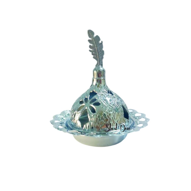 3àIl s’agit d’un couvercle décoratif en métal en forme de dôme, souvent utilisé pour présenter des douceurs, des bougies ou de l’encens. Son design élégant est orné de motifs floraux ajourés qui laissent passer la lumière ou le parfum. Le dessus est agrémenté d’un ornement en forme de plume, ajoutant une touche raffinée et traditionnelle à l’ensemble.